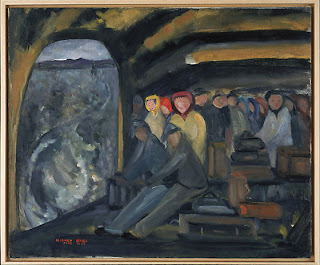 Despite the "positive spin" that the U.S. Gov't tried to give the camps. The reality was that the internees were prisoners that had committed no crime. Hisako Hibi's brushstrokes, gray color palettes, with isolated areas of saturation; and the often solitary figures speak volumes about the loneliness and frustration she must have felt.